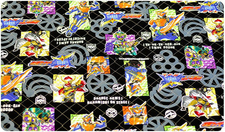 仮面ライダーの新シリーズ 『仮面ライダー鎧武(ガイム)』のキャラクターたちがプリントされたキルティング(キルト)生地です。