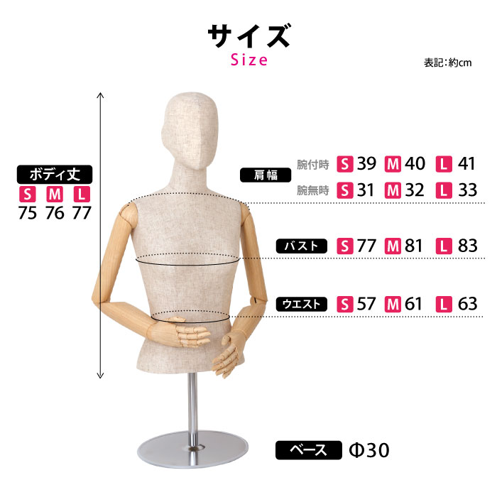 商品名 卓上ボディ レディース 婦人 レディースボディ 卓上マネキン 上半身 顔付き 股あり 腕有り 芯地布張り 円形スチールベース S/M/Lサイズ 型番 SL0889P-2C114-B46 素材 芯材:ポリエチレン 表面:芯地 サイズ(cm) ※号数はあくまで目 安の号数表記になり ます。
