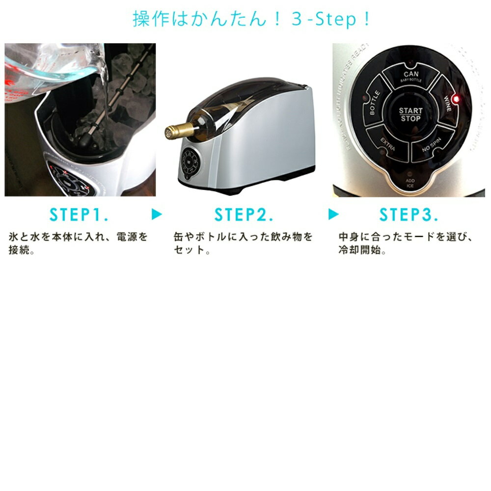 アメリカ生まれのワイン・ビール・ソフトドリンク急速冷却装置 お好きな飲み物を、飲みごろの温度に急速冷却 飲料を回転させますが、ビールや炭酸飲料なども、 開封時に中身が吹き出したりすることなく、冷却できます。